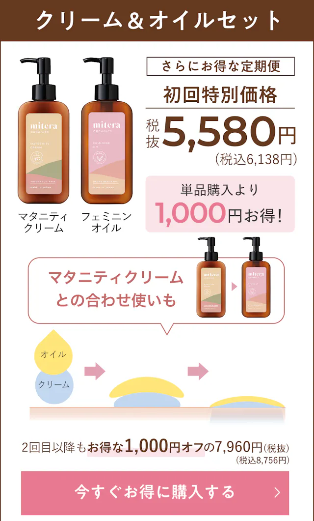 消費者の声。これを塗っているから今日も大丈夫って思えるのが心強い。高保湿だけど必要異常なべたつきはなく、肌への馴染み・伸びもいいのでお腹周りだけではなく全身に使用していました。妊娠中に気になる乾燥やかさつきもサポートしてくれるのですべらかな肌を保ことができました。無添加で肌に優しいので産後は赤ちゃんと一緒に使いたいと思います。やさしい香りでとても癒される。とにかく保湿が大事と聞いてmiteraをお風呂上りにたっぷり塗っています。やさしい香りでとても癒されます。無添加にもこだわっていてテクスチャも伸びがいいので使いやすくて重宝しています。赤ちゃんが生まれてからも一緒に使い続けられるのもとっても嬉しいです。妊娠線ができてからのケアにも使えるのがいい。妊娠初期にお腹が大きくなり始め、はりがなくなってきたので心配になりこちらを使い始めました。妊娠線ができてからのケアにも使える点と、香りが選べるのもよかったです。ちゃんと皮膚科医が監修していたり、無添加なのも気に入っています。