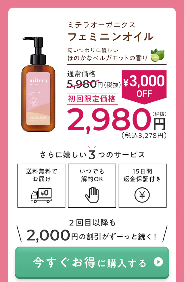 mitera organics公式サイト / 史上初! ヴィーガン処方のフェミニンオイル。会陰ケアに最適。