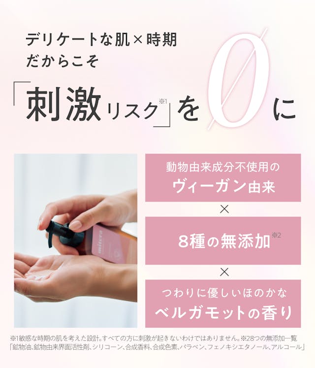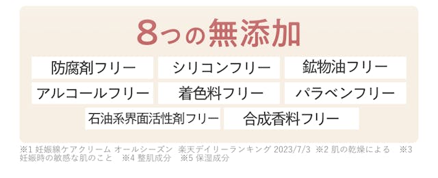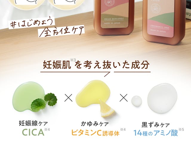 妊娠肌を考え抜いた成分。妊娠線ケアCICA。かゆみケアビタミンC誘導体。黒ずみケア14種のアミノ酸。8つの無添加。防腐剤フリー。シリコンフリー。鉱物油フリー。アルコールフリー。着色料フリー。パラベンフリー。石油系界面活性剤フリー。合成香料フリー。