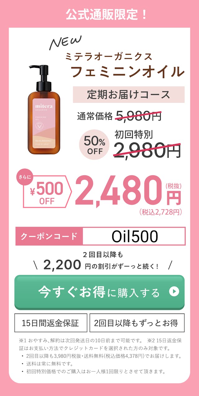 mitera organics公式サイト / 史上初! ヴィーガン処方のフェミニンオイル。会陰ケアに最適。