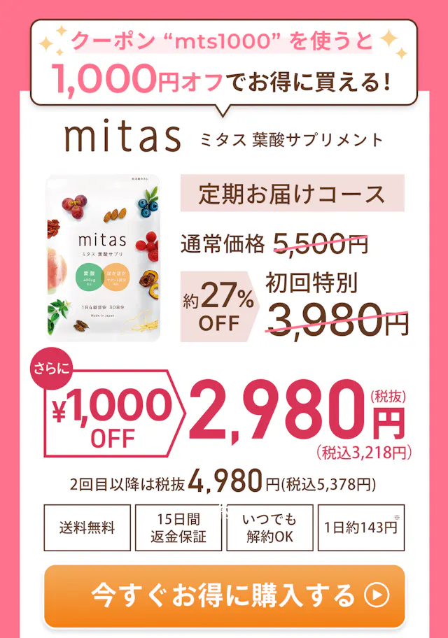 史上初*1、温活もできる妊活専用葉酸サプリmitas (ミタス葉酸サプリ)。妊活期に必要な栄養をオールインワン。Made in Japanで日本製で安心安全。GMP認定工場や安心安全マーク取得済み*3。小粒でとても飲みやすいサイズ。目安1日4粒。Five Doctor’s recommendで専門医推奨。累計44万袋突破*2!かんたん1分Web申し込みができます。注釈:※1:葉酸と温活効果が期待できる和漢素材を組み合わせて配合している葉酸サプリは2019年4月発売時点で当社が史上初(自社調べ)/※2:シリーズ累計出荷数 自社調べ / ※3:本製品は、GMP認定工場(認定番号29220)で製造されました。ただしGMP製品マークの個別審査を受けたものではありません。