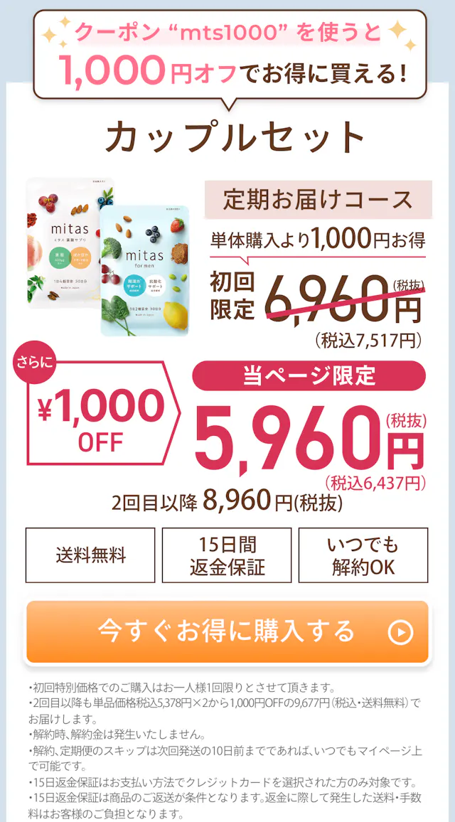 Q&A よくある質問。 Q.1日何粒飲めばいいですか? A.1日4粒が目安となっております。成分によっては過剰摂取となってしまう可能性もございますためそれ以上のご飲用はお止めください。 Q.いつ飲めば良いですか? A.お薬ではございませんので、基本的にはいつお飲みいただいても大丈夫です。一度に4粒お飲みいただいても、複数回に分けてお飲みいただいても問題ございません。 Q.どれくらい続けたらいいですか? A.個人差がございますので、何とも言えないところです。あくまで目安でございますが、「半年~1年」を目途にお考えいただければと存じます。 Q.保存方法は? A.保存に関しましては直射日光、高温多湿を避け、例案所に保存してくださいませ。また商品上部のチャックをしっかりと締めて保存していただくようお願いいたします。 Q.男性ですが飲んでも問題ないですか? A.男性用としてmitas for menをご用意しております。男性に必要な亜鉛も配合されていますし、葉酸、ビタミン類は男女ともに必要な栄養素です。ご夫婦で一緒にお飲みください。 Q.定期便はいつでも解約ができますか? A.次回発送の10日前までであれば、いつでも解約可能ですので、お客様の希望されるタイミングまでお飲みいただくことができます。このページの下部にマイページへのリンクがございますのでご確認ください。※発送10日前を過ぎますと、申し訳ございませんがキャンセルできかねますことご了承くださいませ。