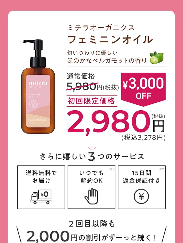 mitera organics公式サイト / 史上初! ヴィーガン処方のフェミニンオイル。会陰ケアに最適。